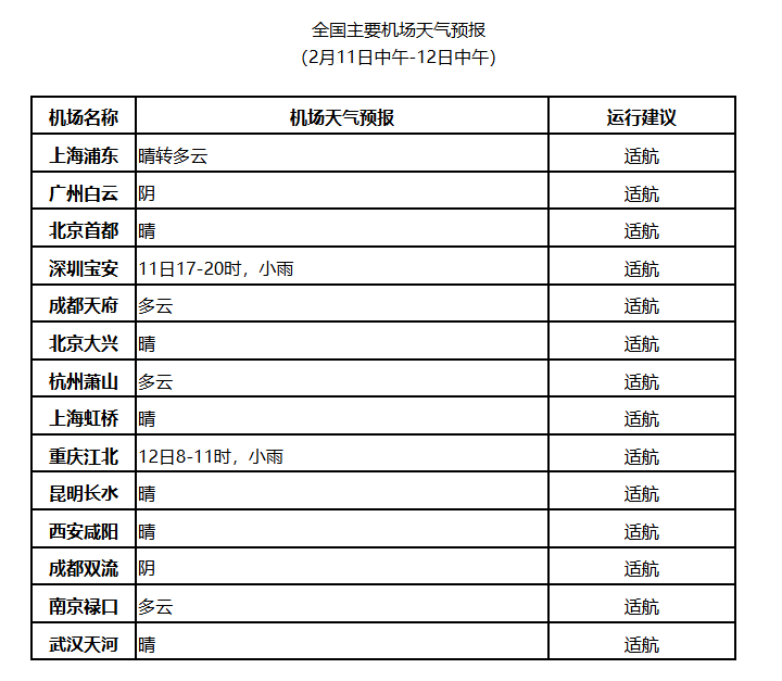 11日中午至12日中午,南宁、长沙等机场有小雨;12日凌晨至早晨,长沙机场有800米左右的雾。