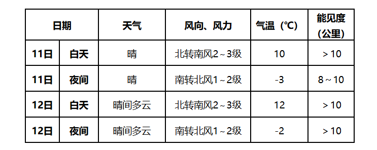 预计11日天气晴,白天风力2~3级,最高气温10℃;夜间风力1~2级,最低气温-3℃。12日天气为晴间多云,风力不大,白天最高气温12℃,夜间最低气温-2℃。