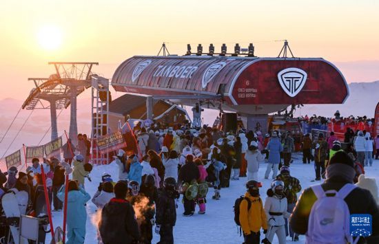 2月25日,滑雪爱好者在新疆阿勒泰将军山国际滑雪度假区参加“夕阳派对”。新华社记者 王菲 摄