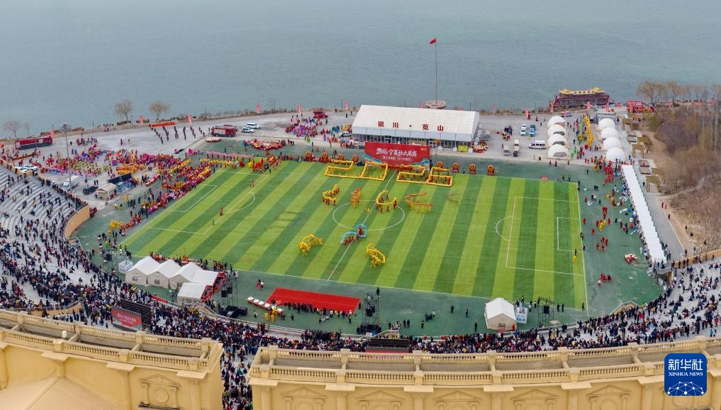 3月1日,在宁夏银川市览山公园,参赛社火队的演员在比赛中(无人机照片)。新华社记者 杨植森 摄