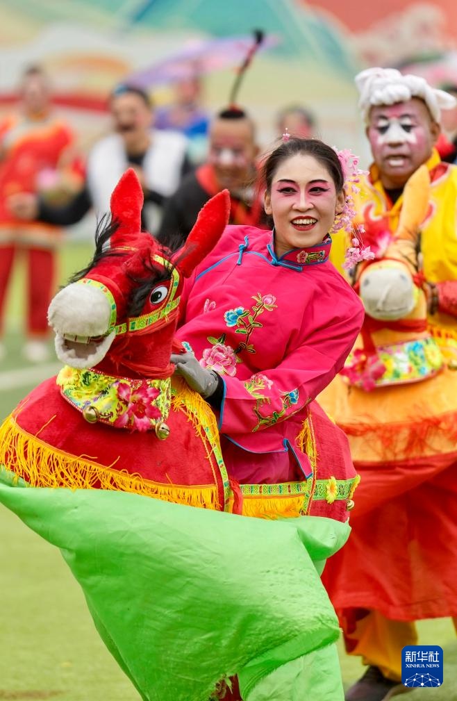 3月1日,在宁夏银川市览山公园,参赛社火队的演员在比赛中。新华社记者 杨植森 摄