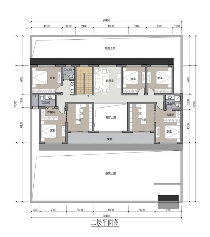 居住重心: 二层主要为居住区,分布有三间大卧室,主卧均配有独立卫浴和衣帽间,居住品质直追五星级酒店。